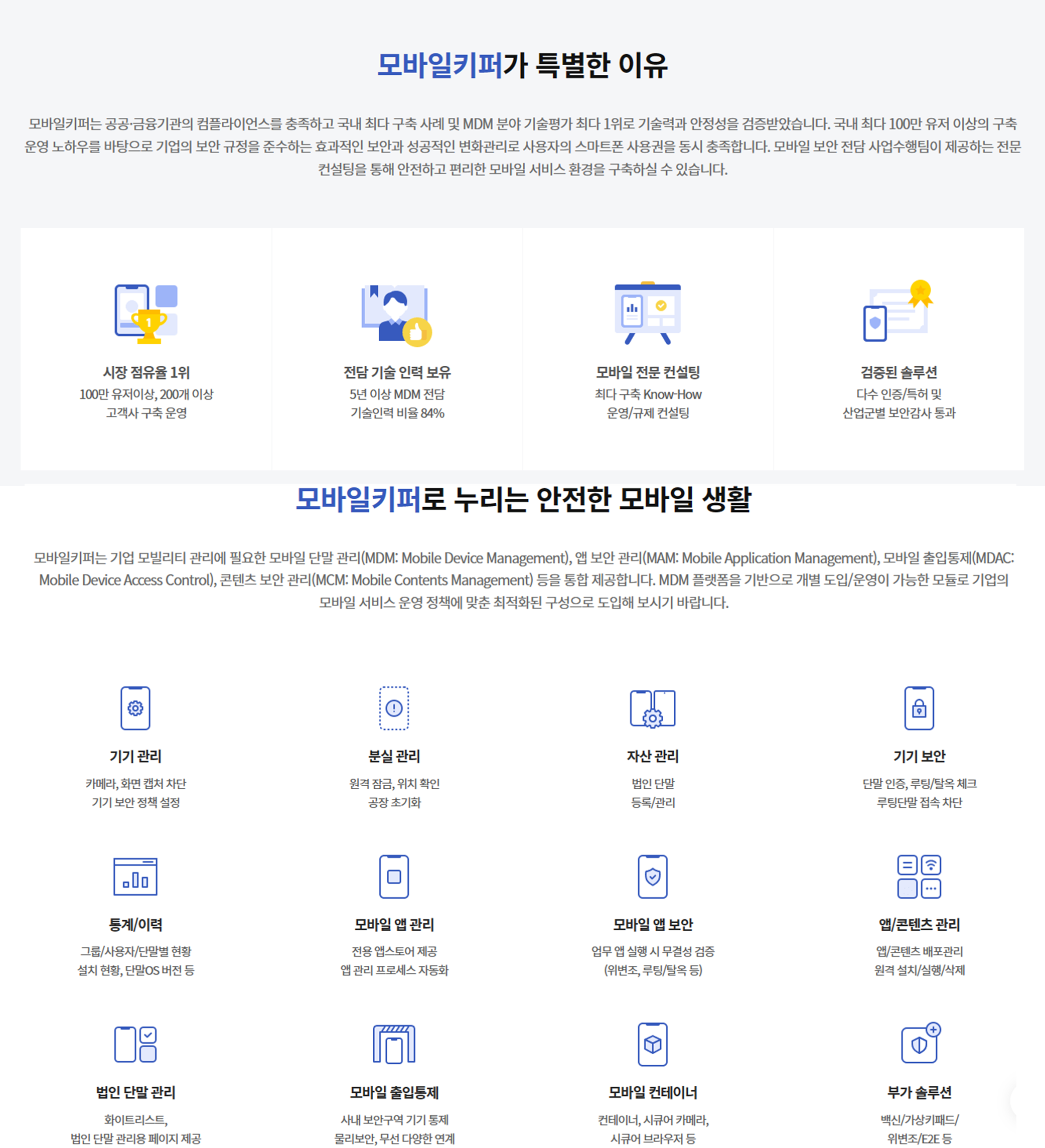 모바일키퍼(MobileKeeper)는 법인 및 개인 단말 관리, 앱 보안, 출입통제를 포함한 기업의 모든 모빌리티를 통합 관리하는 EMM* 솔루션으로 모바일에 대한 관리 및 보안과 업무 생산성 향상까지 책임지는 모바일 통합 플랫폼을 제공합니다.