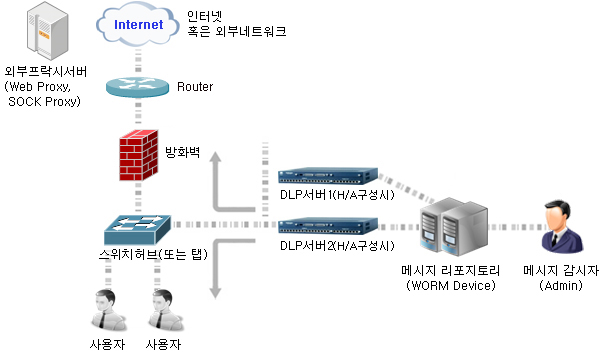 • 이메일, 웹메일, FTP, Telnet, 메신저, 웹하드, 웹게시, P2P, 터널, Proxy, VOIP, 80포트 우회 등으로 오고가는 모든 E-Data와 첨부파일을 모니터링하고 저장